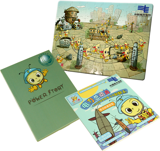"电力总动员"衍生出多类产品,其中包括《电是怎么来的》拼图、《高压线安全知多少》翻翻本、《节电大联盟》笔记本等。